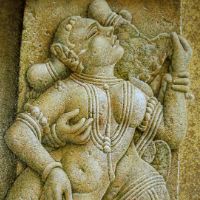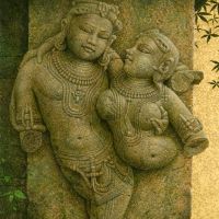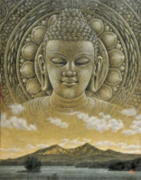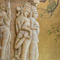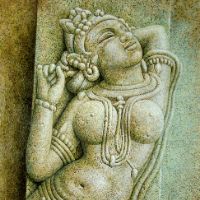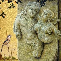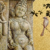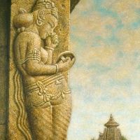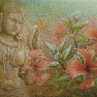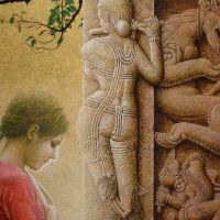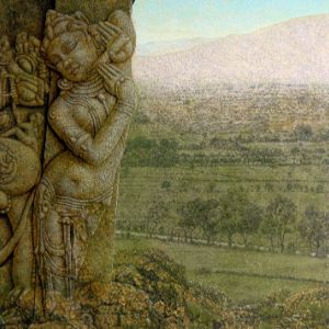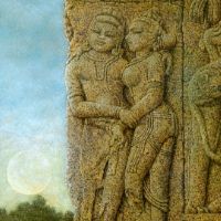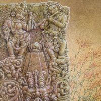 初めてインドを訪れたのは、1973年、25歳の時。かの地で、寺院の外壁を隙間なく飾るヒンズーの神々の像に出会い、私の画家としての人生が本格的に始まりました。カジュラホ、ベルール、ハレビード、コナラク、サンチー、などなど。いろいろな土地で、姿かたちの違う神々の像、ミトゥナーやアプサラス、楽師たちに出会い、その美しさ、愛らしさにひかれ、ひたすら石像を描きました。点描のように見える画法は、石の材質感を表すために考えたものです。